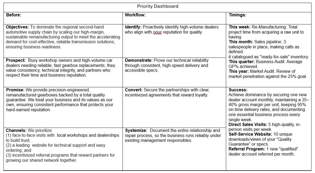 You feel that if you write it down, it will only become another 40-page theoretical plan that no one reads—but the answer isn’t ‘more’ communication; it is different communication. You do not need a volume of rules; you need a Priority Dashboard, that serves as a central communication view. This is not a plan meant for a shelf; it is a live, one-page tool that turns your objectives into specific, daily departmental checklists. By making this visual and concise, you stop being the only person holding the load, and your team stops being ‘order takers,’ becoming instead ‘Communication Responsibles’ who see exactly how their daily output drives the profit you set out to achieve.